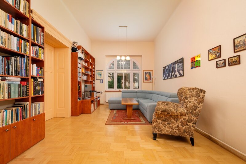 tvoří celkem pět pokojů. Největší z nich, obývací pokoj, má výměru