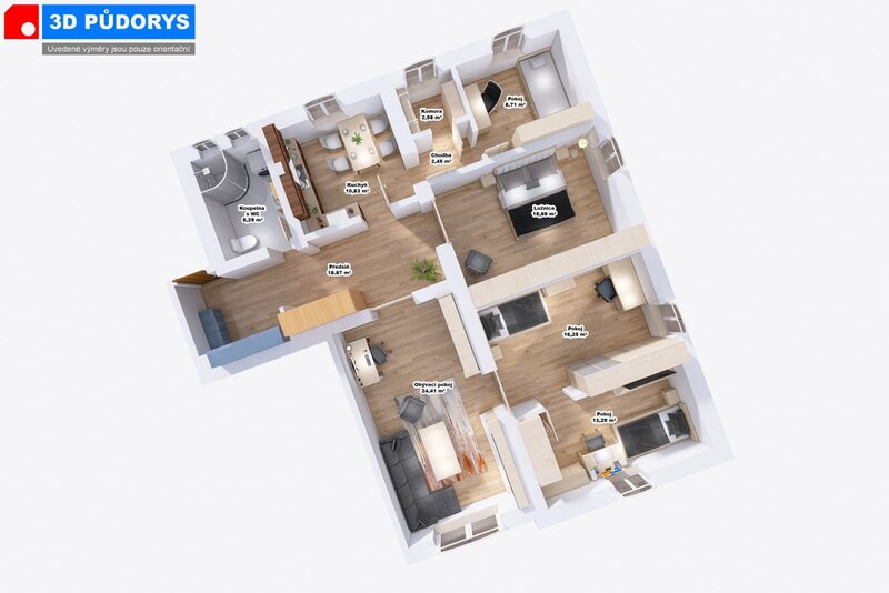 ložnice či dětské pokoje a pátá, menší místnost o velikosti necelých