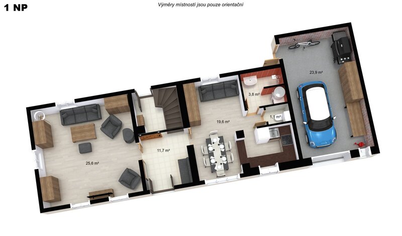 Interiér je rozdělen na společenské přízemí, klidové podkroví a