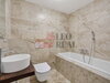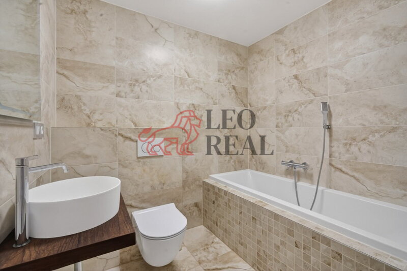 nově obložená koupelna s vanou a nástěnným záchodem se skrytou