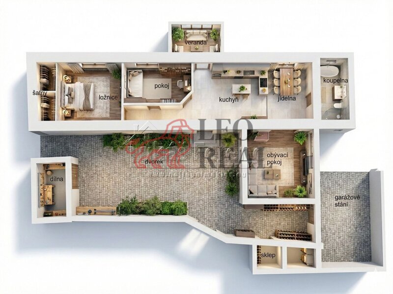 Součástí domu je sklep. Dispozice je praktická, přehledná a vhodná jak