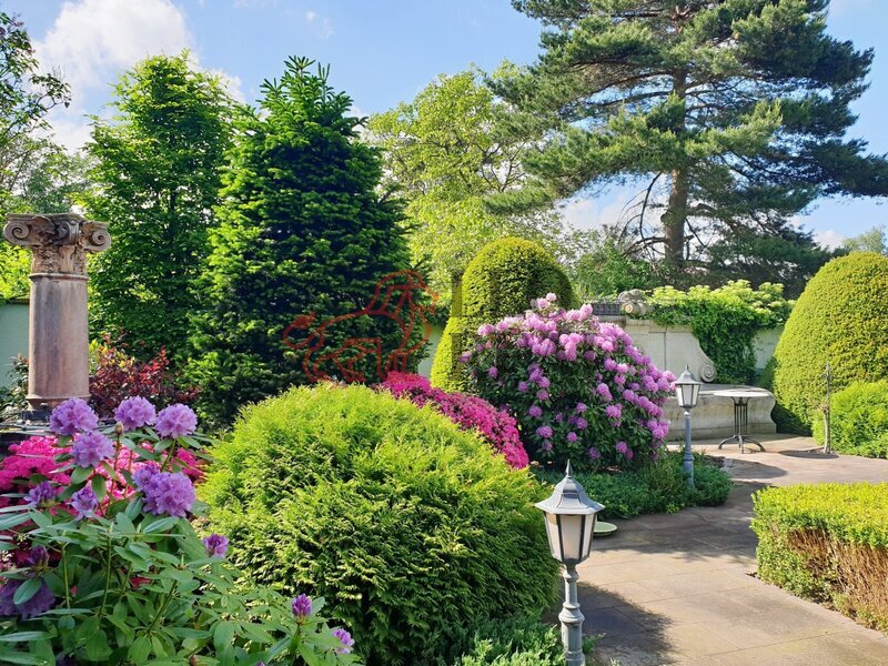 vzrostlých stromů a okrasných dřevin. Atmosféru dotvářejí pískovcové