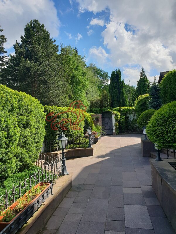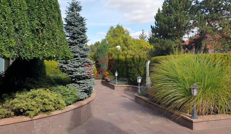 chodníčky, originální skulptury a stylové lampy pro noční osvětlení.