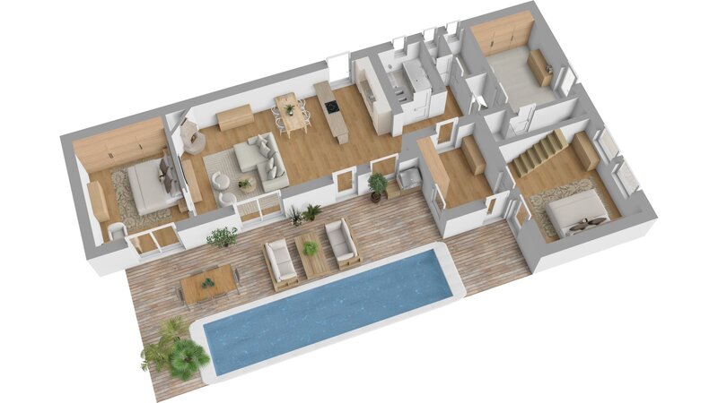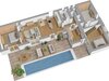 Dispozice domu (celková plocha 163 m², plocha pokojů 132m²)