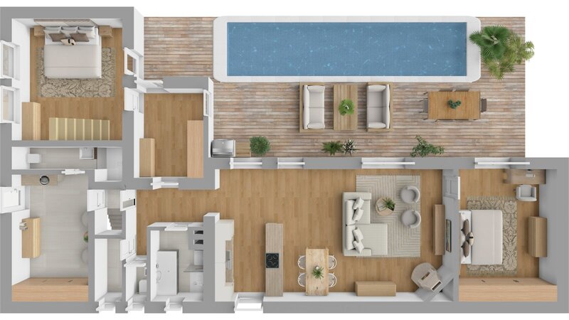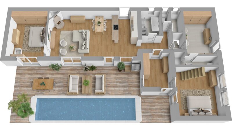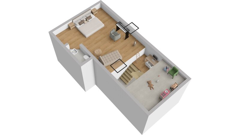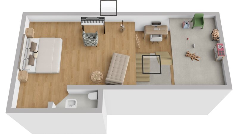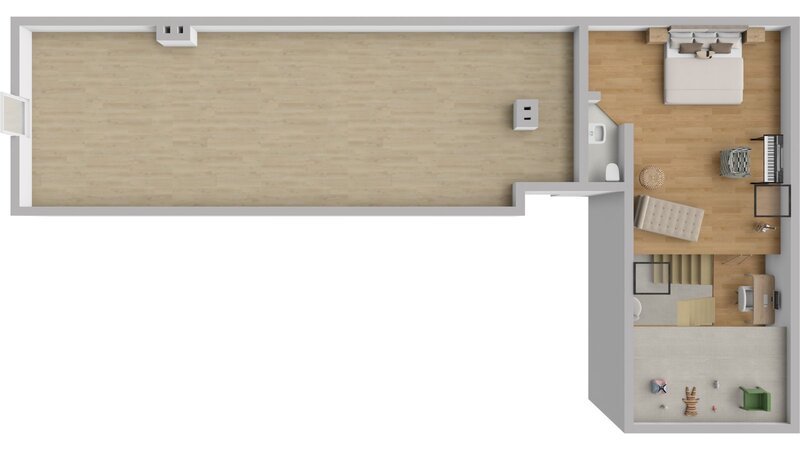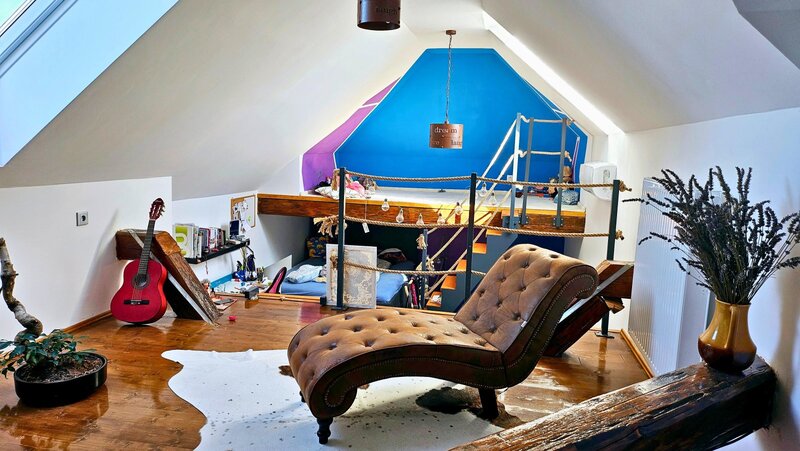 (9m²), a dětský koutek (5m²). Na tento prostor navazuje pokoj v podkroví