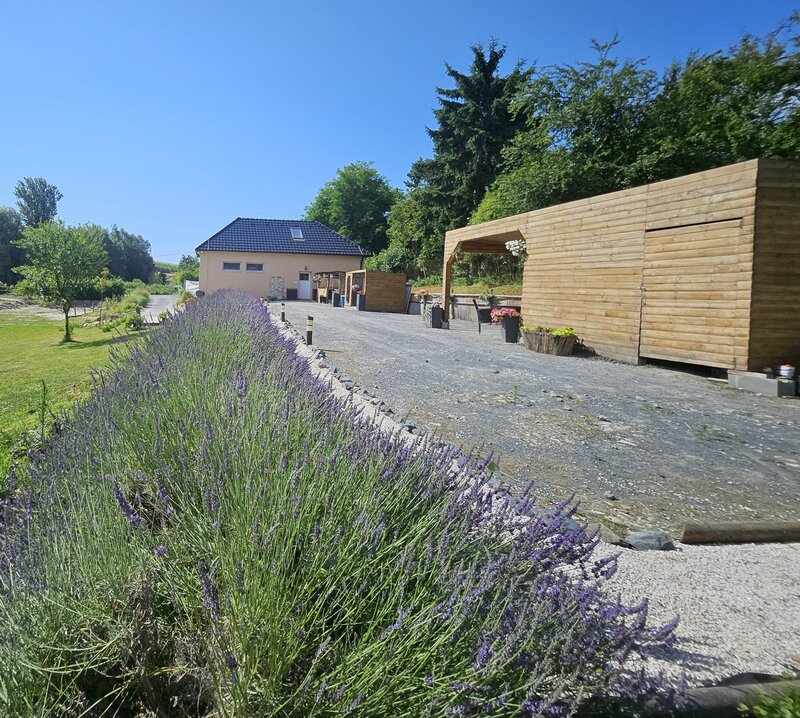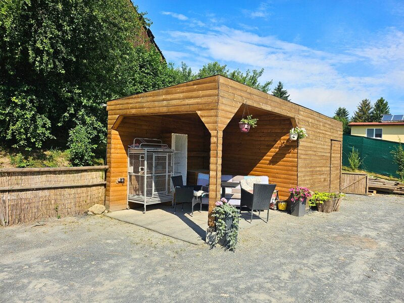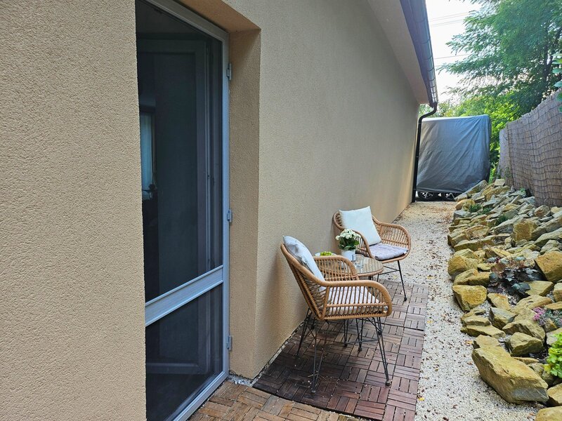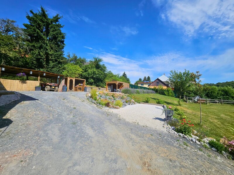 travinami a relaxační zónou. Z terasy si užijete výhled na zelené kopce a
