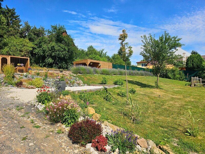 Zahrada je citlivě navržena – s trvalkami, bylinkami, okrasnými keři