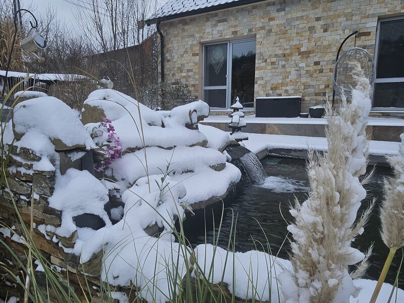Dominantou venkovní části je přírodní koupací jezírko lemované kamenem,