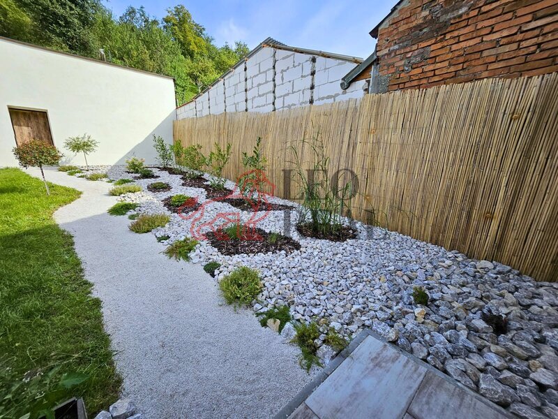 Zahrada (cca 600 m²) je rozdělená na dvě části – rovnou se