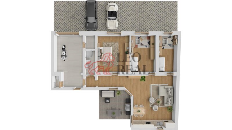 prostorný obývací pokoj s kuchyňským koutem a vstupem na zastřešenou