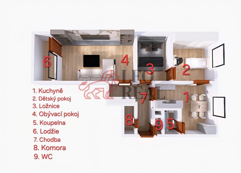 dispozice 2+1 na 3+1 přepažením mezi ložnicí a dětským pokojem.