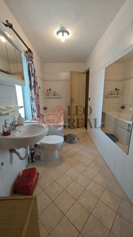 prostornou koupelnou s vanou, umyvadlem a toaletou a v podkroví malou